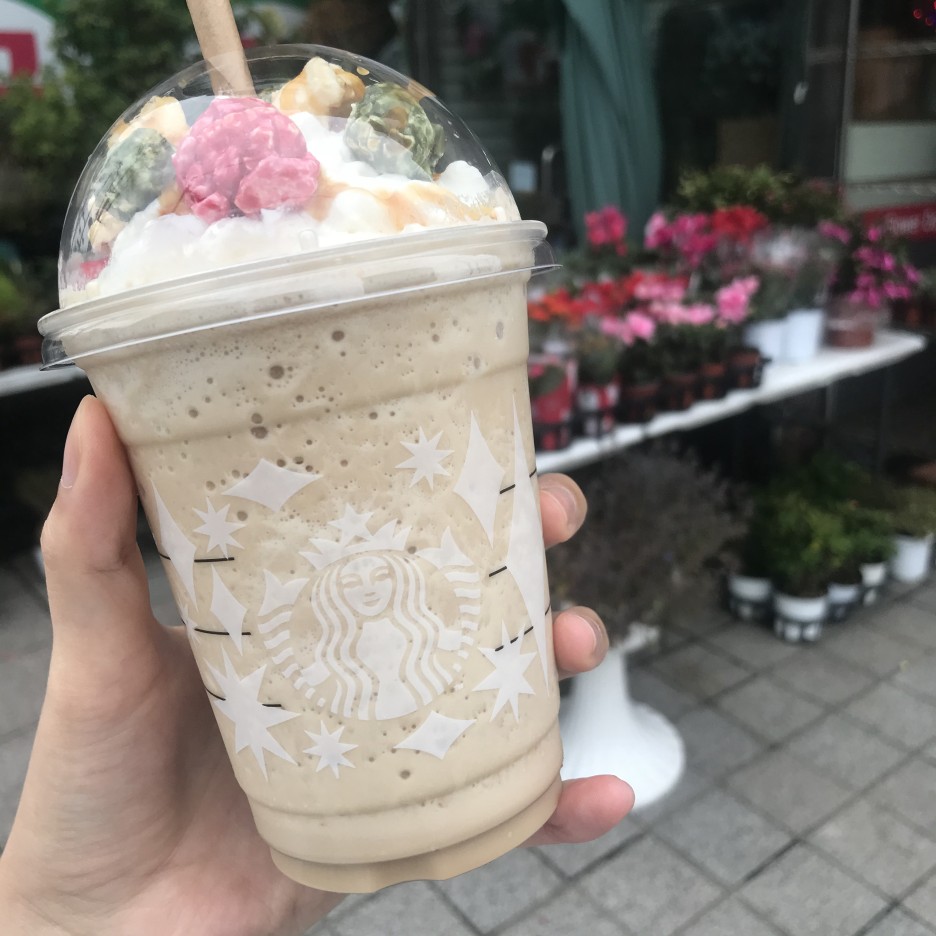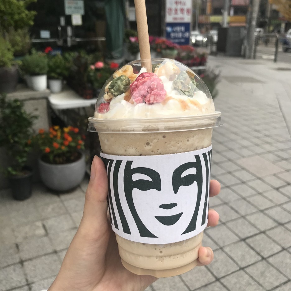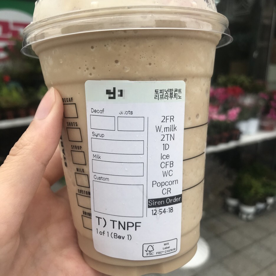 오늘은 시즌음료가 궁금해서 토피 넛 팝콘 트리 프라푸치노를 주문했습니다