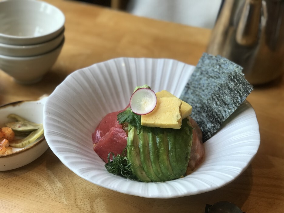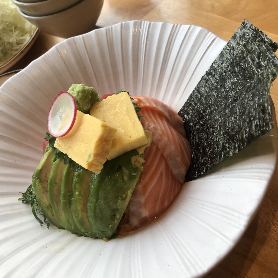 참치, 연어, 아보카도가 올려진 참연아 덮밥이에요.