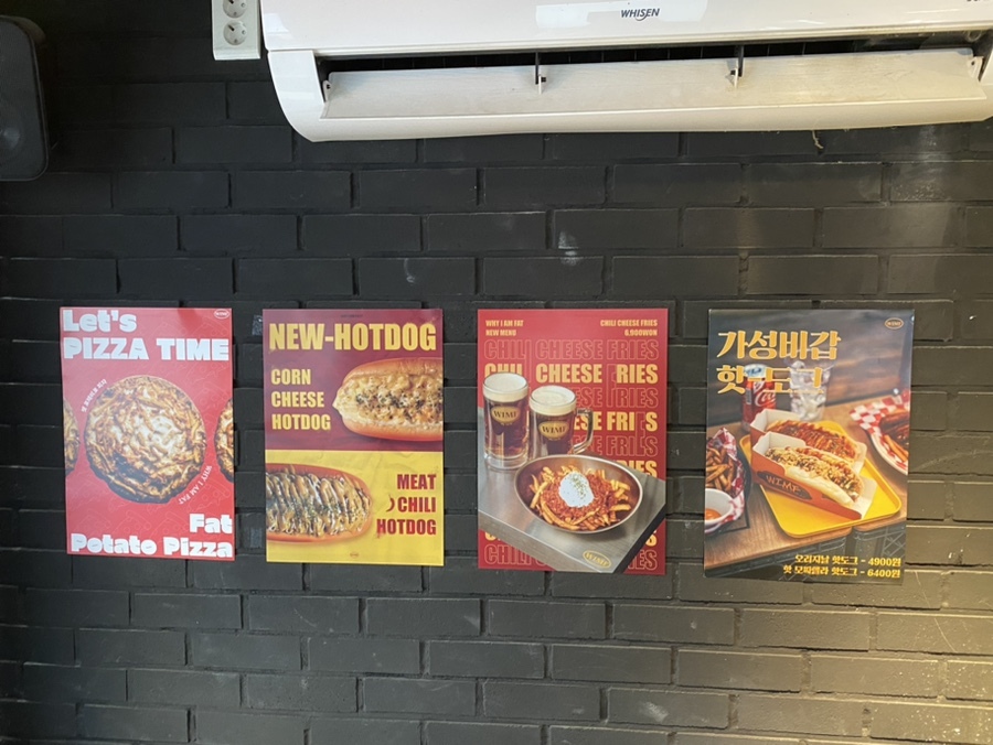 핫도그, 피자, 감자튀김 등 다양한 메뉴가 있어요.