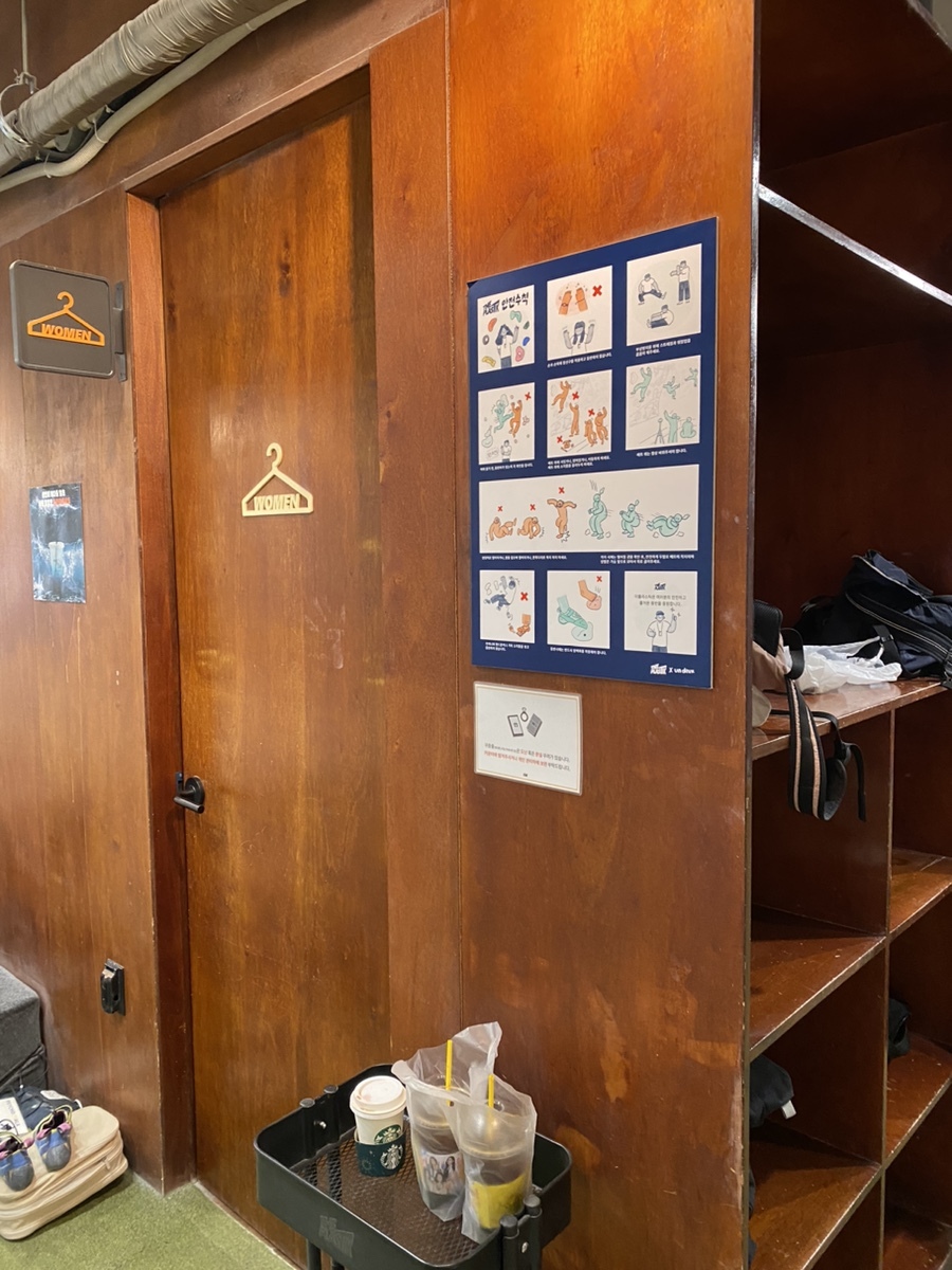 1층으로 들어가서 암장을 지나 지하 1층이 탈의실이에요.