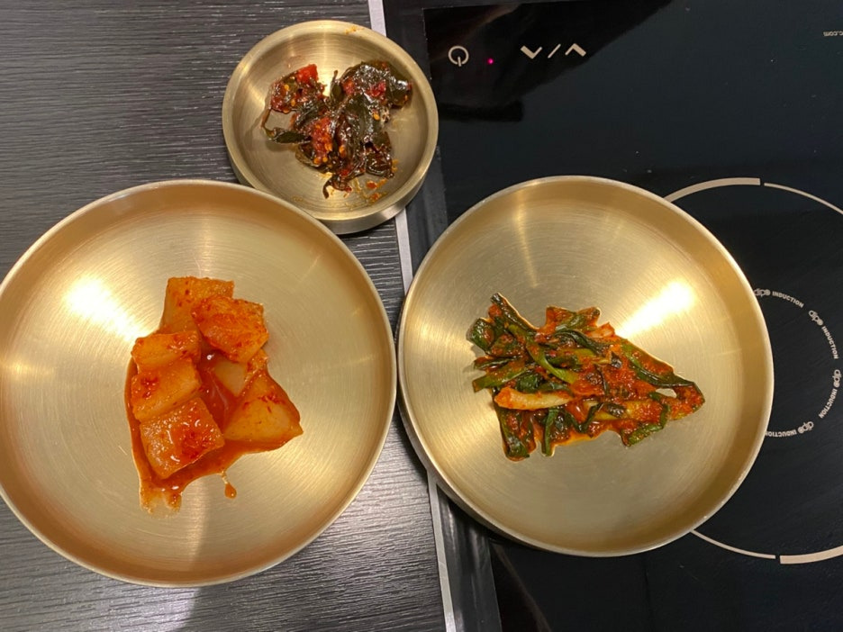 반찬은 깍두기 파김치, 무슨 잎 무침이 나와요.