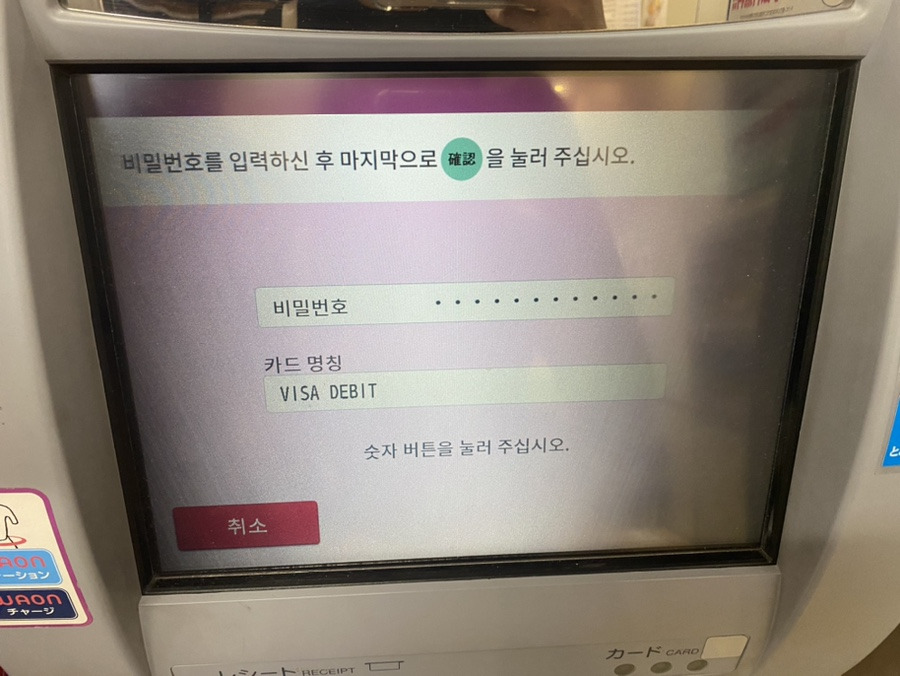 카드를 넣은 후, 비밀번호 입력을 해주는 것까지 우리나라와 똑같죠?
